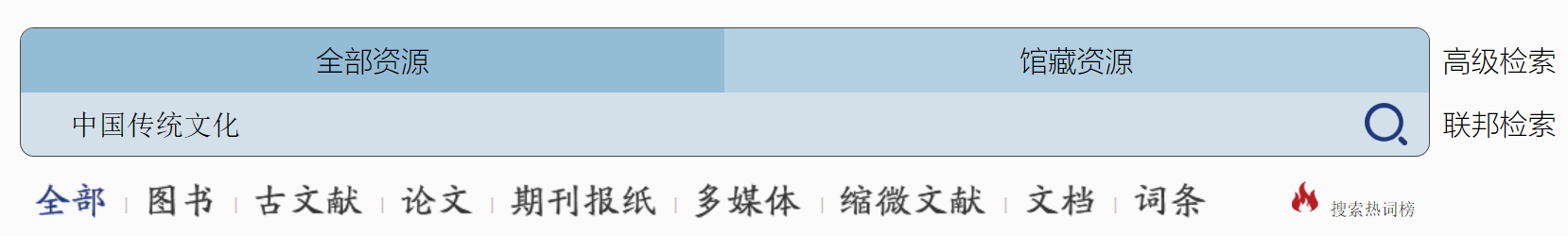例如:读者想在"全部资源"中查找涉及中国传统文化的资源,先点击"全部资源",在搜索框内直接输入“中国传统文化”,敲击回车键(或者点击"搜索"按钮)。