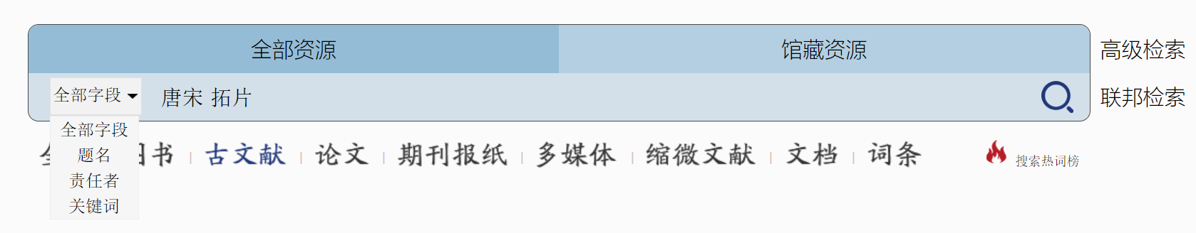 例如:检索唐宋拓片,导航栏中先选择"古文献"资源,再在字段中选择关键词。根据不同类别专业检索字段快速查找资源。