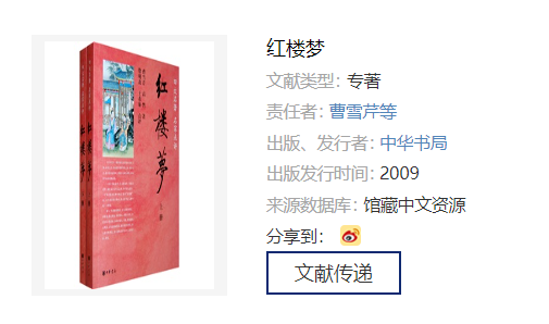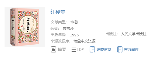 对于可点击的字段信息,可直接点击以查看相关信息。例如点击图示中的“曹雪芹等”或“中华书局”,可将在文津搜索系统中直接输入“曹雪芹等”或“中华书局”搜索的结果显示出来;点击“到百度查看本资源”,可将在百度中搜索到的文献名称显示出来;在更多相关资源下点击任意信息,可直接查看此文献的详情页面。