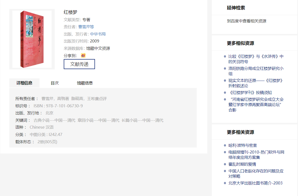 详情页将展示搜索到的文献的详细信息、摘要、目次和馆藏信息等内容,可提供在线阅读,支持快速分享到新浪微博,并且可实现通过超链接形式一键在百度图书或本系统中进行搜索或直接展示相关内容。