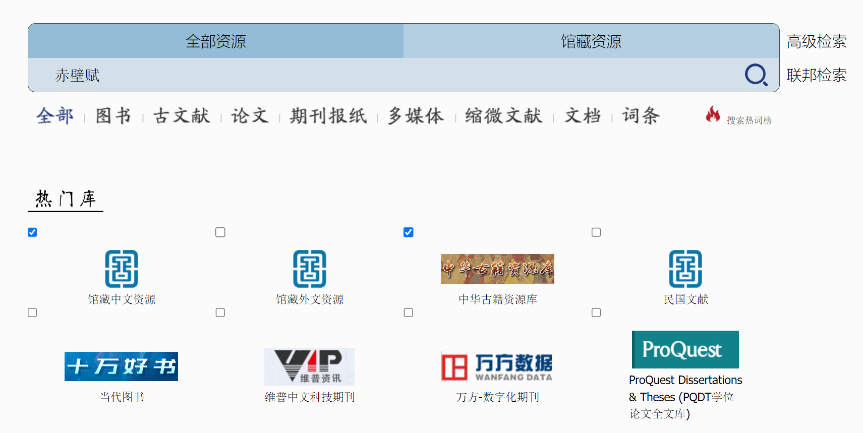 例如:用户想在“馆藏中文资源”和“中华古籍资源库”中检索“赤壁赋”。先在“热门库”中选择“馆藏中文资源”和“中华古籍资源库”,然后在搜索框中输入“赤壁赋”,敲击回车键(或点击“搜索”按钮)。