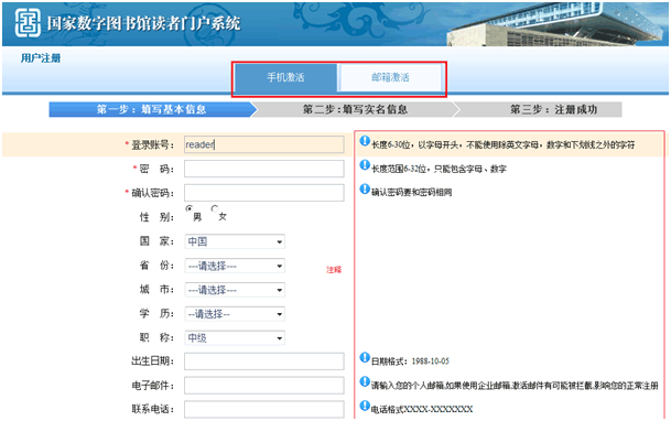 文津搜索首页提供了登录与注册入口,点击 “注册”后,用户可以进入到“国家数字图书馆读者门户系统”的注册页面。用户可通过两种方式进行注册激活,一种是通过手机激活,一种是通过邮箱激活。手机激活需要读者准确提供自己的手机号码,而邮箱激活则需要读者准确提供自己的邮箱地址。这两种注册验证方式均需要经过填写基本信息、填写实名信息和注册成功三个步骤。对每一个操作步骤我们都在右侧进行了详细说明。