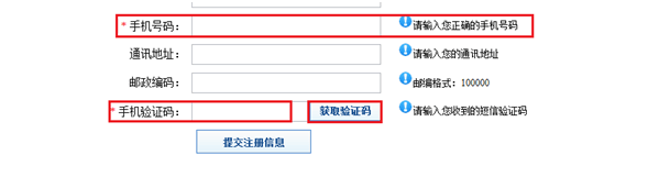 使用手机激活的读者需在相应对话框中输入手机号码,并点击“获取验证码”按钮。随后,可在注册的手机上接收到短信验证码,将其输入到相应对话框中,点击“提交注册信息”即可进入到下一步。手机注册页面如下图所示。